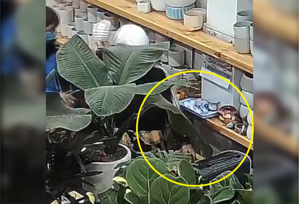 Người phụ nữ dàn cảnh trong lúc mua cây cảnh để trộm chiếc điện thoại trên mặt bàn. Ảnh chụp từ clip