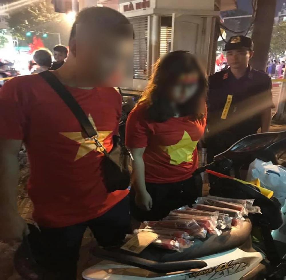 Khuya 6-12, khi đám đông cổ động viên cuồng nhiệt xuống đường ủng hộ chiến thắng đội tuyển Việt Nam, NTG (24 tuổi) và NTT (21 tuổi, cùng trú tại Đống Đa, Hà Nội) đã vận chuyển pháo sáng, pháo đốt trong người và cốp xe máy thì bị tổ công tác Y7/141 phát hiện.