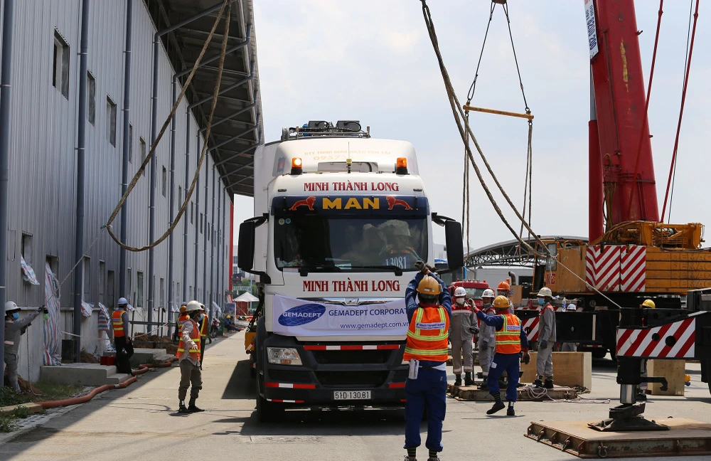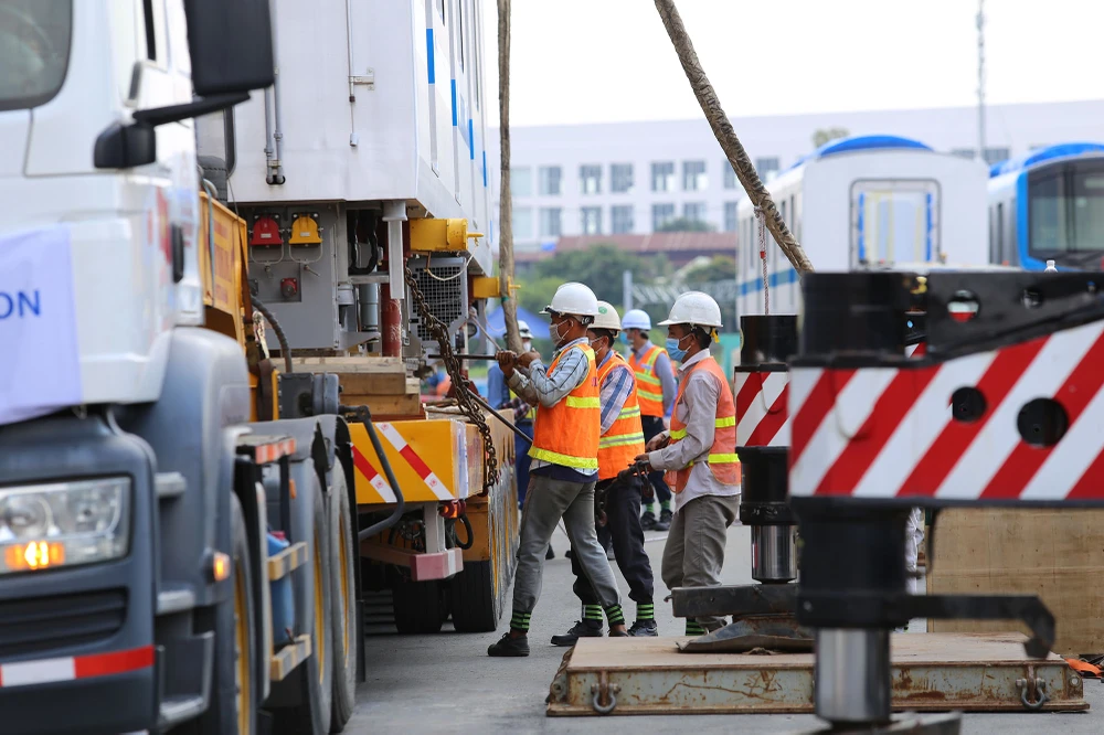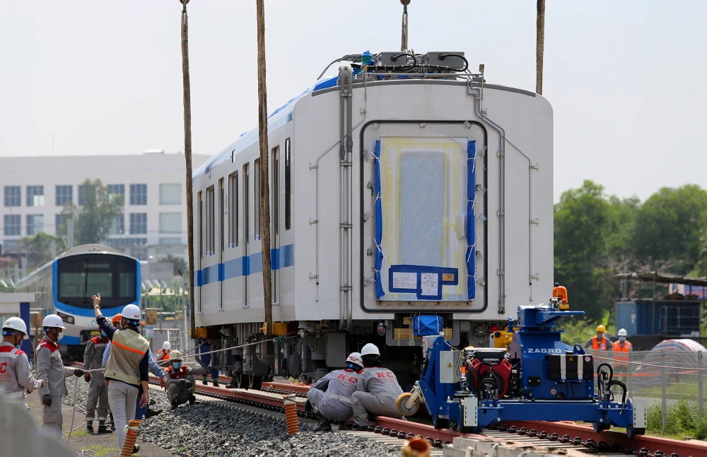 Khoảng 12 giờ ngày 11-5, 3 toa tàu của đoàn tàu số 2 thuộc tuyến metro số 1 lần lượt được cẩu từ xe siêu trường siêu trọng lắp đặt lên đường ray tại depot Long Bình (TP Thủ Đức).