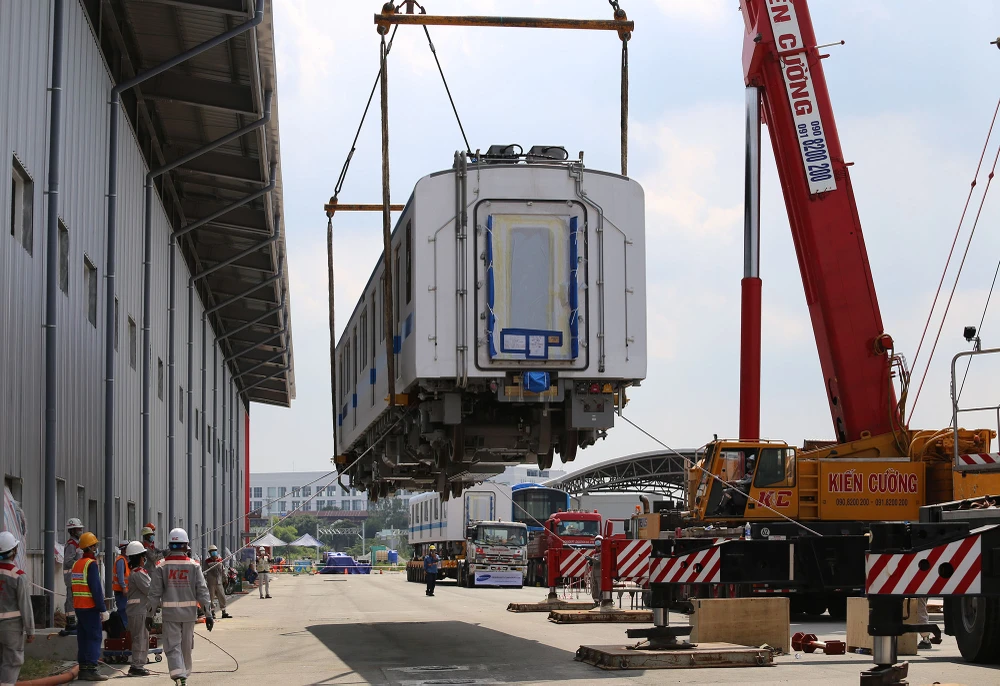 Qúa trình cẩu và lắp đặt toa tàu metro lên đường ray mất khoảng 1 giờ đồng hồ.