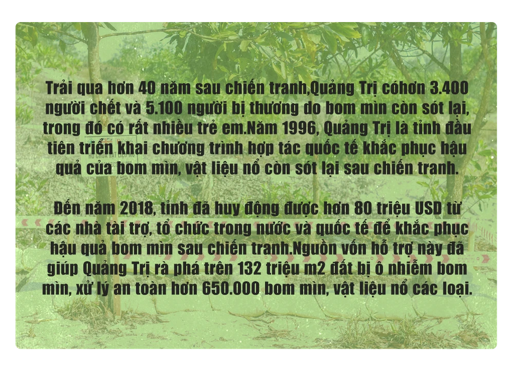 Hàng ngày, những người rà phá bom, mìn và vật liệu nổ vẫn tiếp tục “chiến đấu” với một thế lực ngầm trong lòng đất để hồi sinh lại vùng quê có diện tích ô nhiễm chiếm hơn 81% tổng diện tích toàn tỉnh.