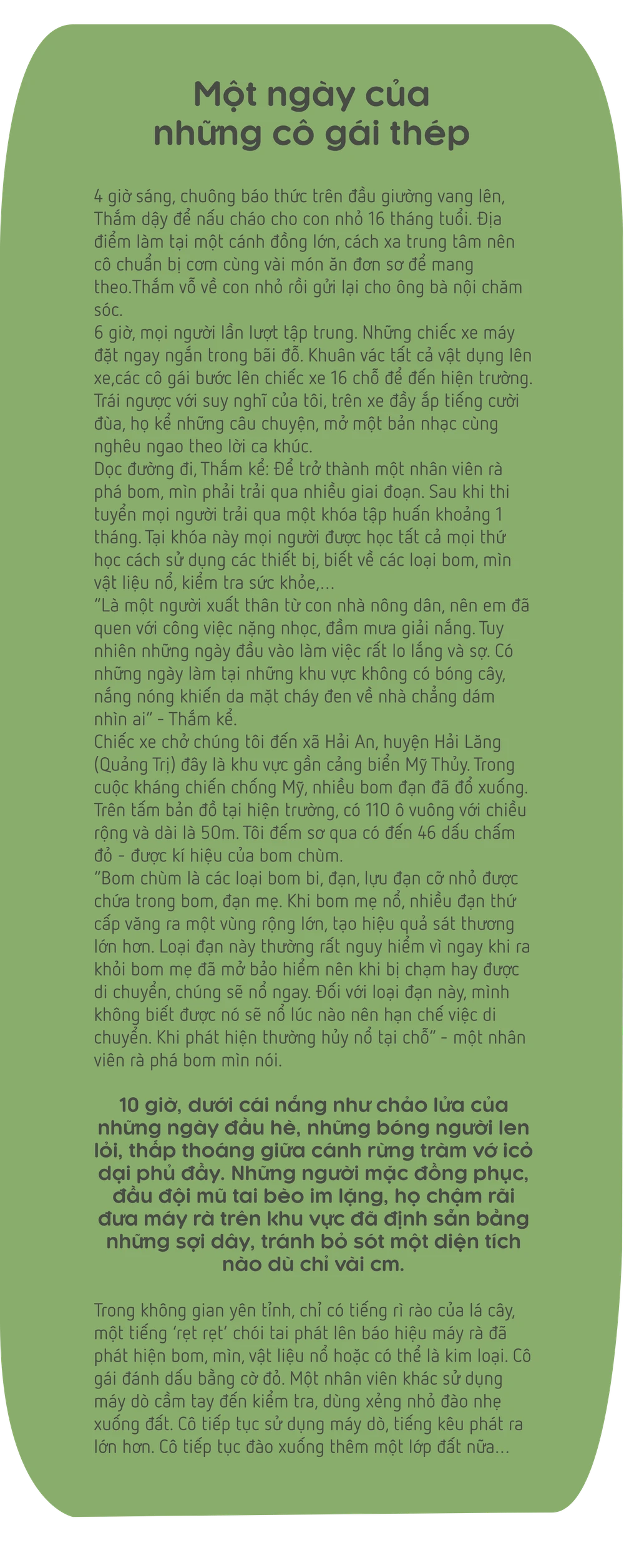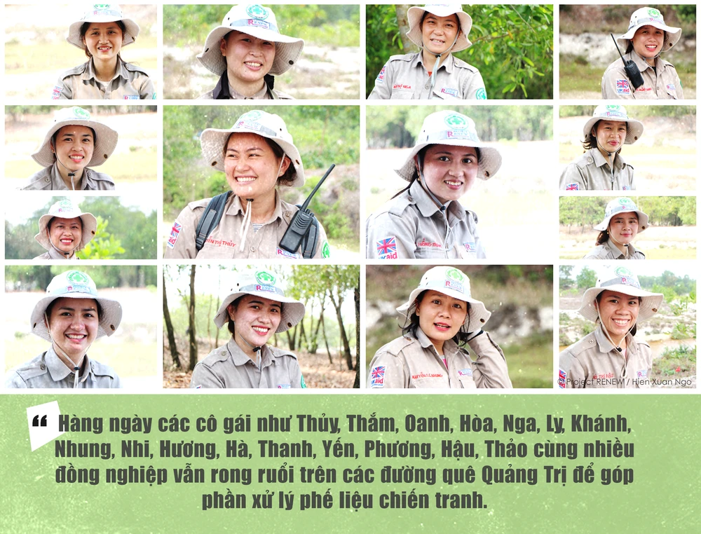 Trong ngày hôm nay, đội nữ rà phá bom mìn đã trả lại hơn 4.500m2 đất sạch cho người dân xã Hải An. Rồi cứ như thế, hàng ngày các cô gái như Thủy, Thắm, Oanh, Hòa, Nga, Ly, Khánh, Nhung, Nhi, Hương, Hà, Thanh, Yến, Phương, Hậu, Thảo cùng nhiều đồng nghiệp vẫn rong ruổi trên các đường quê Quảng Trị để góp phần xử lý phế liệu chiến tranh.