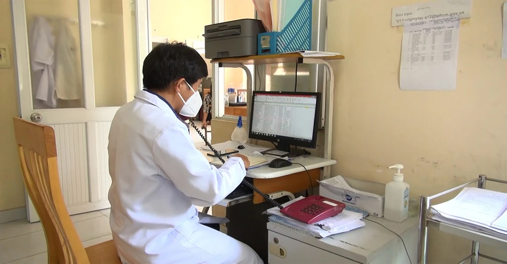 Bác sĩ Thiệt luôn túc trực ở trạm y tế để nhận các cuộc gọi của người dân qua đường dây nóng. Ảnh: HT