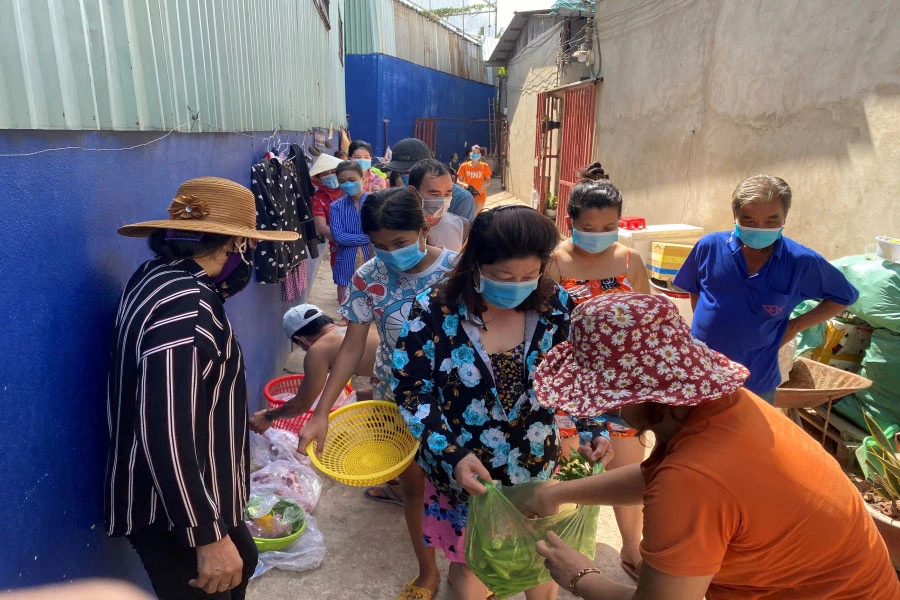 Người dân ở khu trọ nhận rau củ trong ngày 22-6 do đội phản ứng nhanh