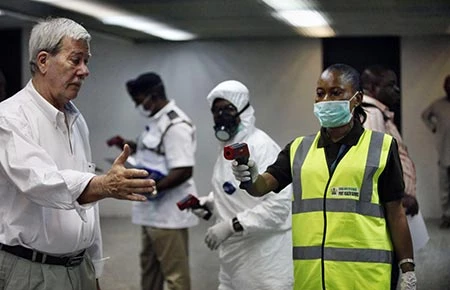 Đo thân nhiệt kiểm tra bệnh Ebola tại sân bay ở Lagos (Nigeria) ngày 6-8. Ảnh: AP