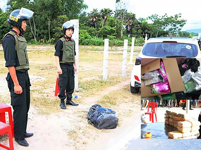 Rạng sáng 26-6, khi bị Công an tỉnh Hà Tĩnh truy đuổi, hai người trên ô tô vứt hai ba lô chứa 31 kg ma túy đá. Ảnh nhỏ: Công an liên tục bắt giữ ma túy tuồn từ các cửa khẩu Lào, Campuchia vào Việt Nam. (Ảnh do công an cung cấp)