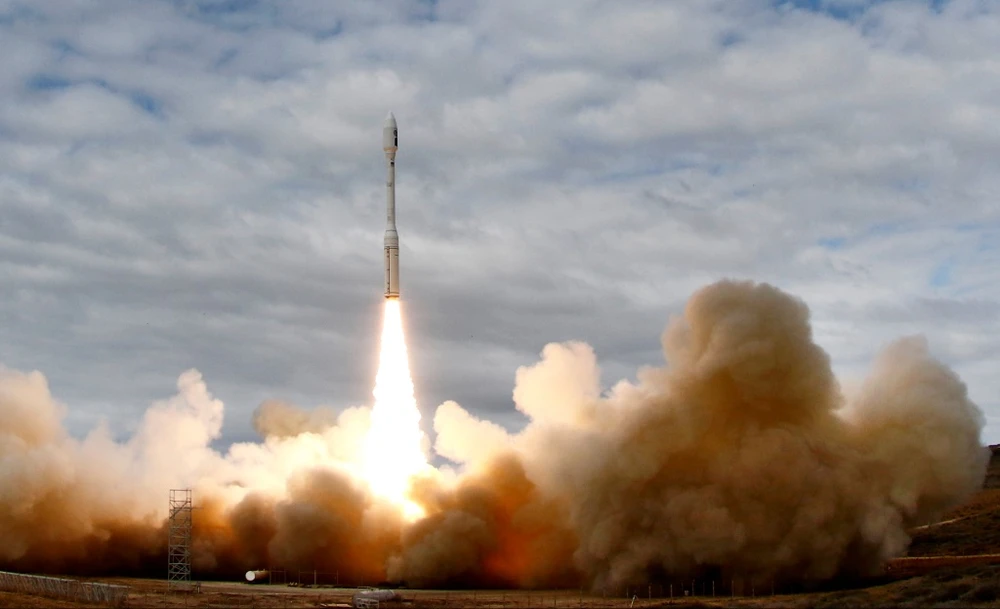 Tên lửa đẩy Minotaur-C (sử dụng nhiên liệu rắn) của Mỹ mang 10 vệ tinh thương mại vào không gian ngày 31-10-2017. Ảnh: LOS ANGELES DAILY NEWS