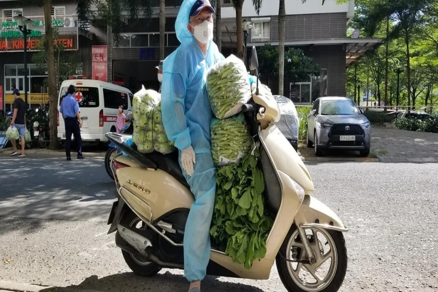 Các tình nguyện viên chở rau củ bằng xe máy vào tận sảnh của từng block cho cư dân. Ảnh: NVCC