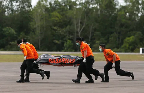 Đội tìm kiếm và cứu hộ di chuyển cấp tốc thi thể của một nạn nhân chuyến bay AirAsia QZ8501 tại căn cứ không quân Iskandar Indonesia. Ảnh: REUTERS