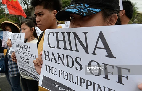 Chủ đề biển Đông được nêu tại Đối thoại Shangri-La vì các nước lo ngại hải quân Trung Quốc. Trong ảnh: Cuộc biểu tình ngày 3-3 ở Manila phản đối Trung Quốc chiếm bãi Hải Sâm (quần đảo Trường Sa của Việt Nam). Ảnh: AFP