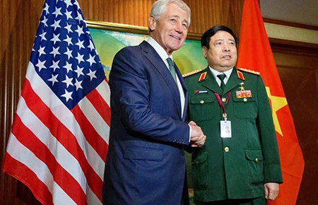 Bộ trưởng Quốc phòng Mỹ Chuck Hagel tiếp xúc song phương với Bộ trưởng Quốc phòng Việt Nam Phùng Quang Thanh. Ảnh: AP