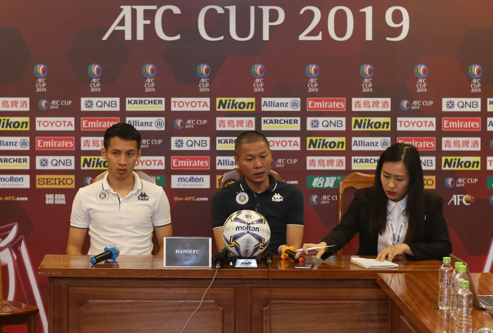 HLV Chu Đình Nghiêm và Hùng Dũng dự họp báo trước trận đấu.