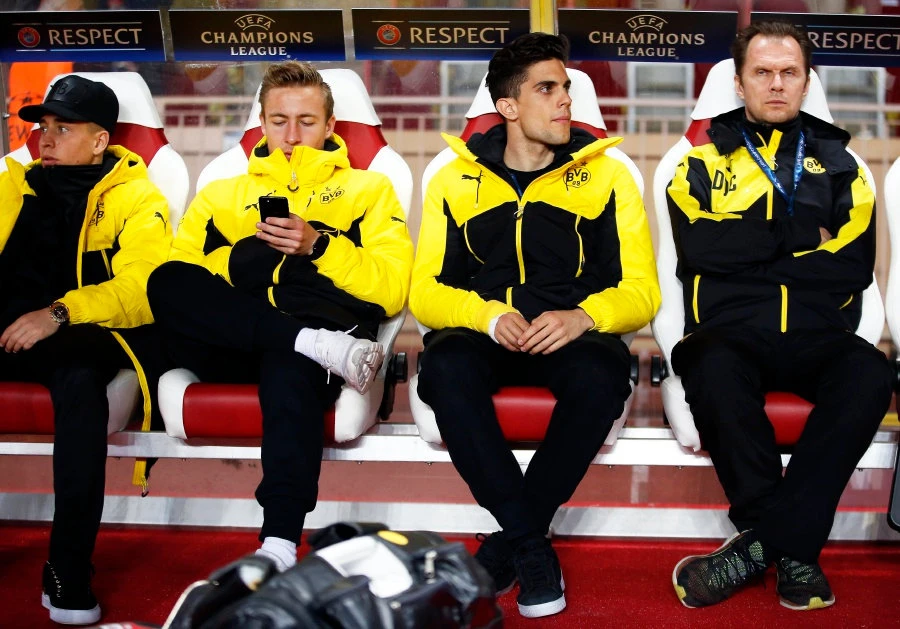 Các cầu thủ Dortmund bất lực ngồi xem đội thua tiếp lượt về ở sân Luis II.