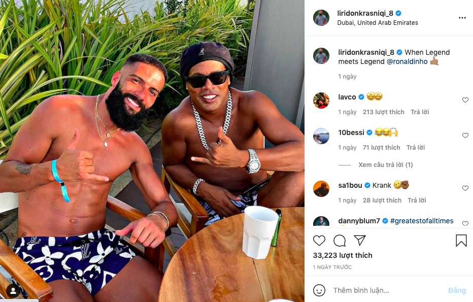 Trên trang xã hội của mình, Krasniqi khoe chụp hình cùng Ronaldinho. Ảnh: Getty