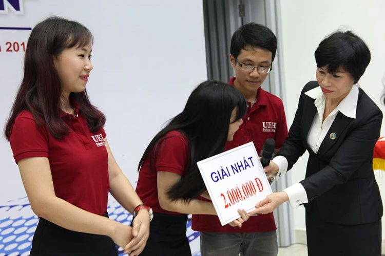 LS Phùng Thị Hòa trao giải nhất cuộc thi cho ĐH Kinh tế TP.HCM. Ảnh: HOÀNG GIANG