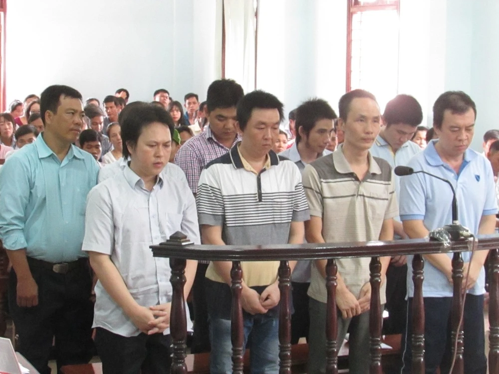 Chín bị cáo đứng nghe cáo trạng tại tòa ngày 21-6. Ảnh: NN
