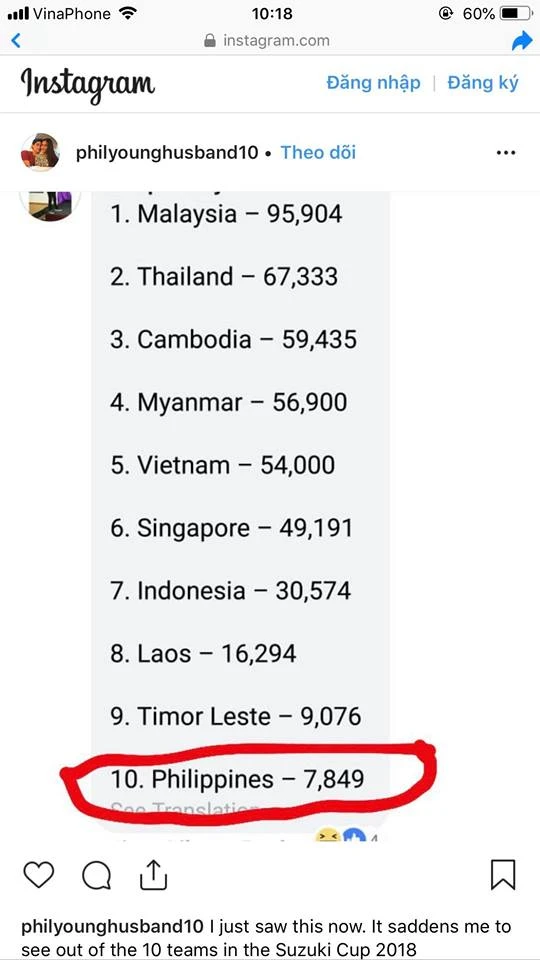 Phil dẫn chứng bảng xếp hạng về lượng khán giả đến sân ở vòng bảng: Philippines đứng cuối, Việt Nam thứ nhì.