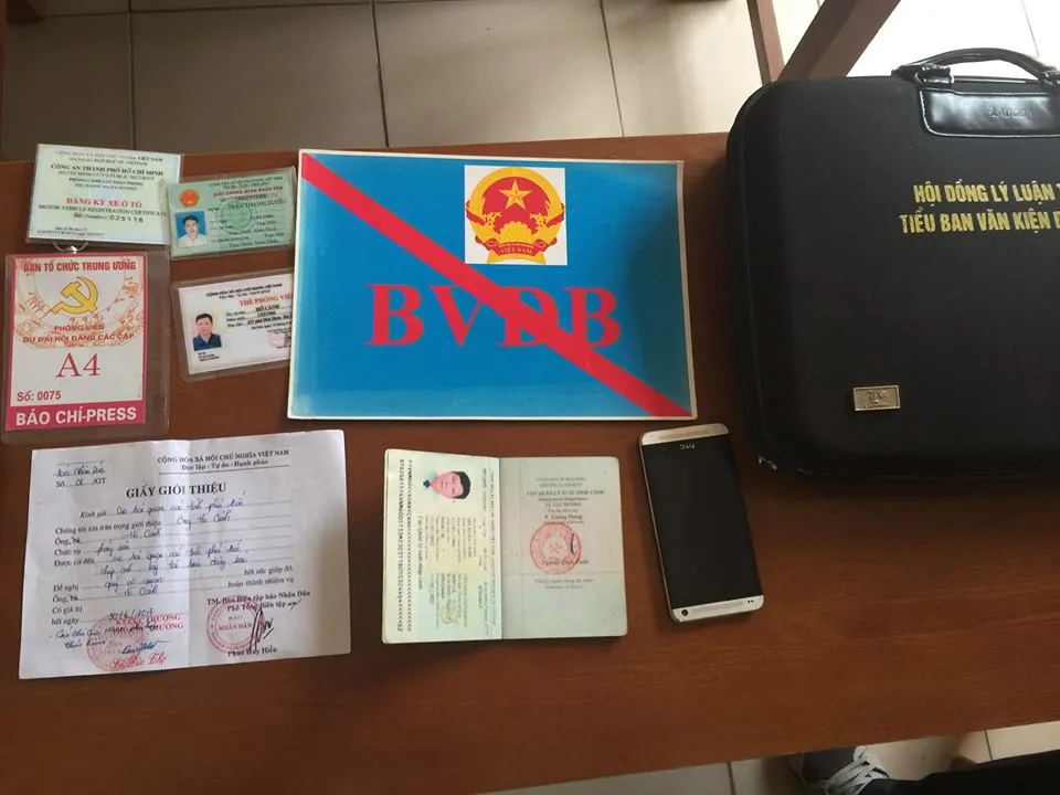 Đối tượng trình các giấy tờ liên quan, trong đó có thẻ PV và giấy giới thiệu của báo Nhân Dân mang tên Hồ Cảnh.