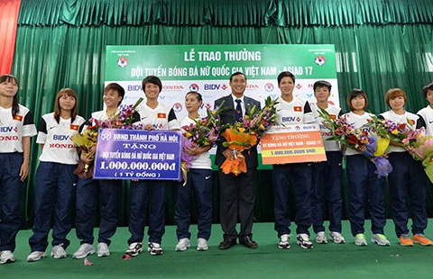 Đội tuyển nữ Việt Nam nhận phần thưởng từ thành tích cao ở Asiad 2014. Ảnh: QUANG THẮNG