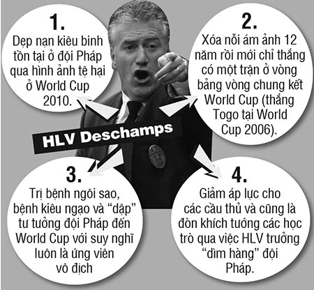 Dư luận Pháp và các cầu thủ Pháp vẫn còn ảo tưởng nhiều sau chiếc cúp vô địch 1998 cùng thế hệ Zidane và Deschamps. Nay HLV Deschamps lại muốn người Pháp bắt đầu từ một đội bóng khiêm tốn và có tính kỷ luật, đoàn kết cao thay cho những sự cố và ảo tưởng mình là nhà vô địch.