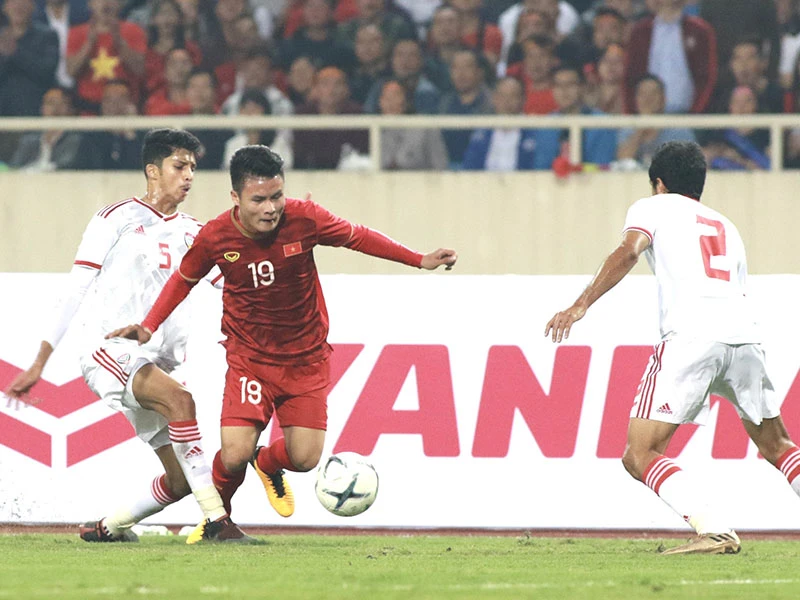 UAE lượt đi đã thua VN nên đang tìm mọi cách tạo ưu thế để thực hiện cuộc lội ngược dòng. Ảnh: NGỌC DUNG