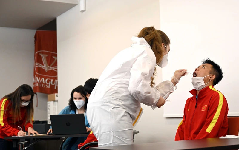 Ban tổ chức giải test RT-PCR cho các tuyển thủ Việt Nam. Ảnh: AN.