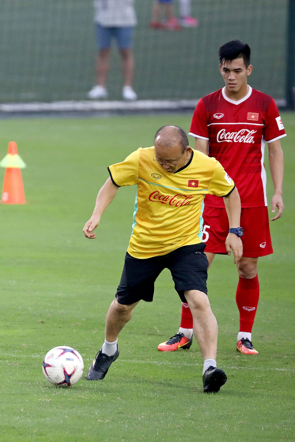 HLV Park Hang-seo lúc cao hứng chạy vào sân đá bóng chung với các học trò.