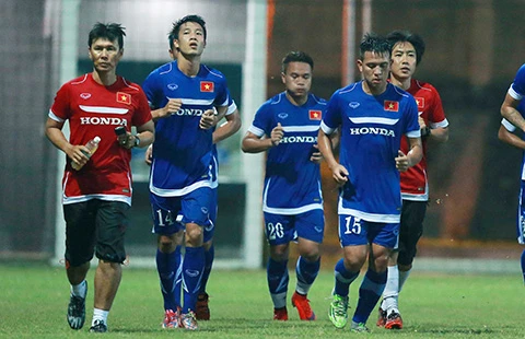 Thầy trò HLV Miura đang ráo riết tập luyện chuẩn bị đón đội tuyển Iraq. Ảnh: QUANG THẮNG