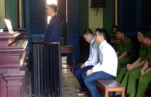 Bị cáo Lâm (đứng trước vành móng ngựa) và hai bị cáo Tuấn Anh, An tại phiên xử ngày 18-8-2015. Ảnh: H.YẾN