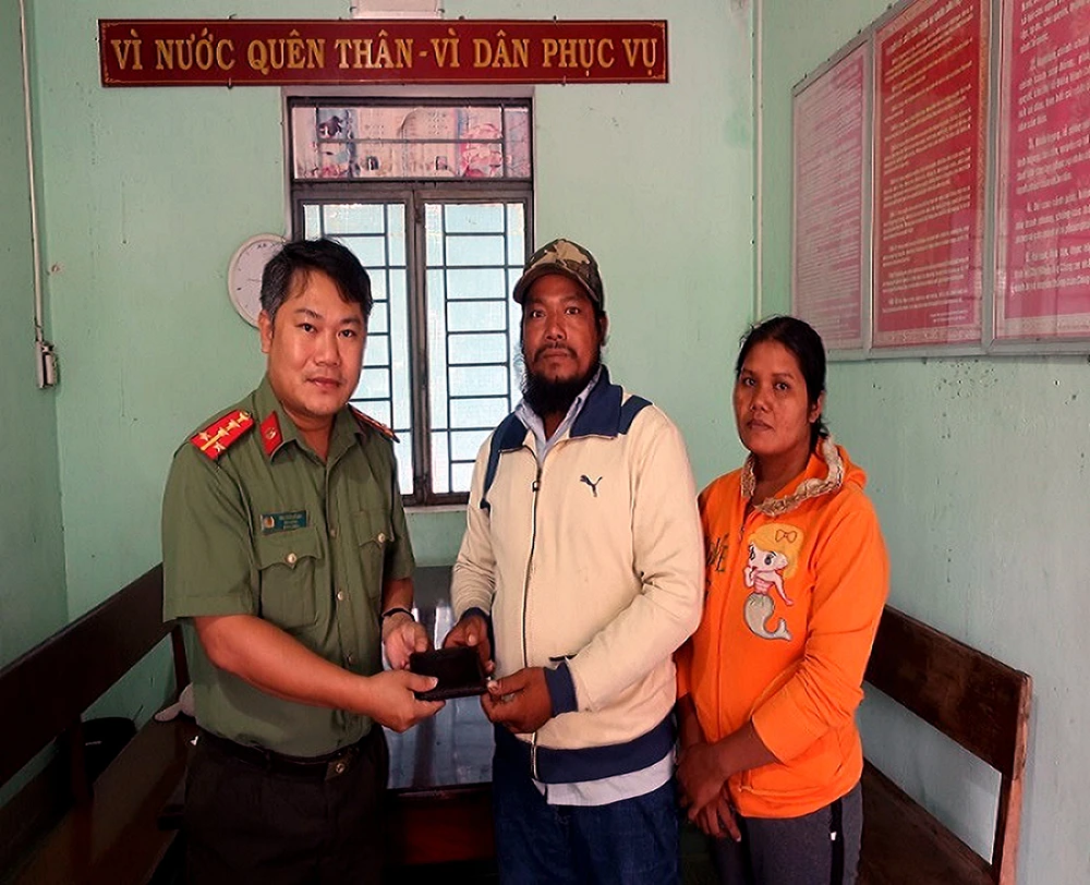 Vợ chồng anh Nay Lueh trao chiếc ví để công an tìm nạn nhân trả lại.