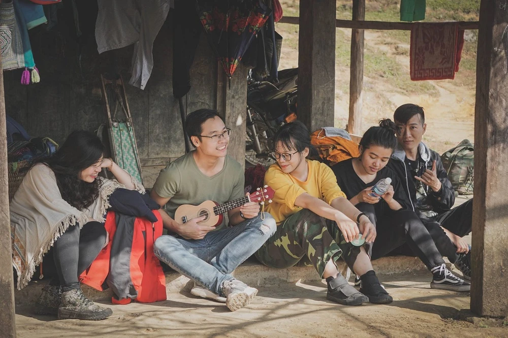 Những chiếc xe máy cứ thế bám đuôi nhau leo lên con đường đất đá ấy, có vài đoạn ngắn ngắn được đổ bê tông nhưng cũng không nhằm nhò gì so với quãng đường đá kia. Có lúc tưởng như con đường đó sẽ kéo dài mãi thì 10 giờ hơn, cả nhóm đến một căn nhà dưới bản Nhìu Cồ San để gửi xe và ăn trưa. Đó là một ngôi nhà nhỏ đơn sơ và giản dị.