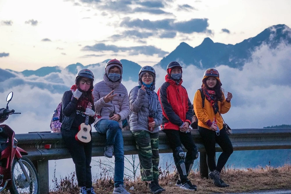 Ở lưng chừng đèo, những đám mây trắng xóa như bông đang lững lờ trôi, phía trên là ánh nắng mặt trời vàng chói lọi xuyên qua từng kẽ lá. Đây là lần đầu tiên trong đời, tôi được tận mắt nhìn thấy cảnh tượng hoành tráng của bình minh. Đứng trên cao, chúng tôi càng cảm nhận được cái lạnh của Sapa bởi gió thổi mạnh văng thẳng vào người khiến đã lạnh càng thêm lạnh.