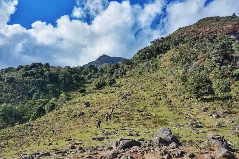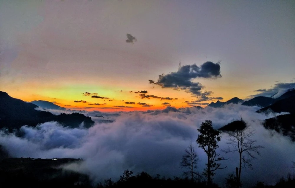 Lại là những đoạn dốc cao liên tục, nhiều lúc đầu gối tôi mỏi tới mức muốn rụng rời nhưng vẫn tự nhủ cố lên. Đi được một đoạn kha khá dài, tôi quay đầu nhìn lại thấy ánh đèn le lói từ nhà bếp của lán nghỉ, xa xa hơn nữa là một biển mây trắng xóa nằm im lìm trong làn mây mù. Biển mây ấy như là động lực cho cả đội để lên đến đỉnh.