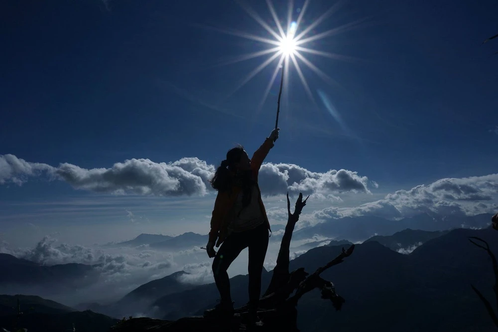 4 giờ sáng sớm hôm sau, cả nhóm lục tục gọi nhau dậy ăn sáng và chuẩn bị leo lên đỉnh. Trời tối mù mịt, gió vù vù lạnh thấu xương, trên trời những ngôi sao vẫn chưa chịu đi ngủ. Trong ánh đèn pin lẫn đèn flash từ điện thoại, chúng tôi cứ thế lầm lũi đi. Lần đầu tiên trong mấy lần trekking tôi dậy sớm đến vậy, bình thường đi hay gặp mưa nên toàn ngủ đến 6 giờ mới dậy ăn uống nhưng lần này được trải nghiệm với bóng đêm.