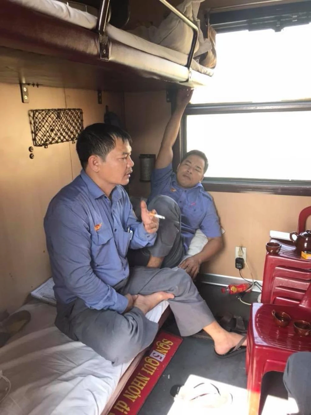 Mấy anh em đi tàu ngồi uống trà tán dóc, cười đùa rôm rả. Mùa tàu Tết, xí nghiệp tăng từ sáu đôi tàu mỗi ngày lên gấp đôi số tàu khu đoạn, người vẫn thế, không tăng nên gần như anh em phải đi suốt.