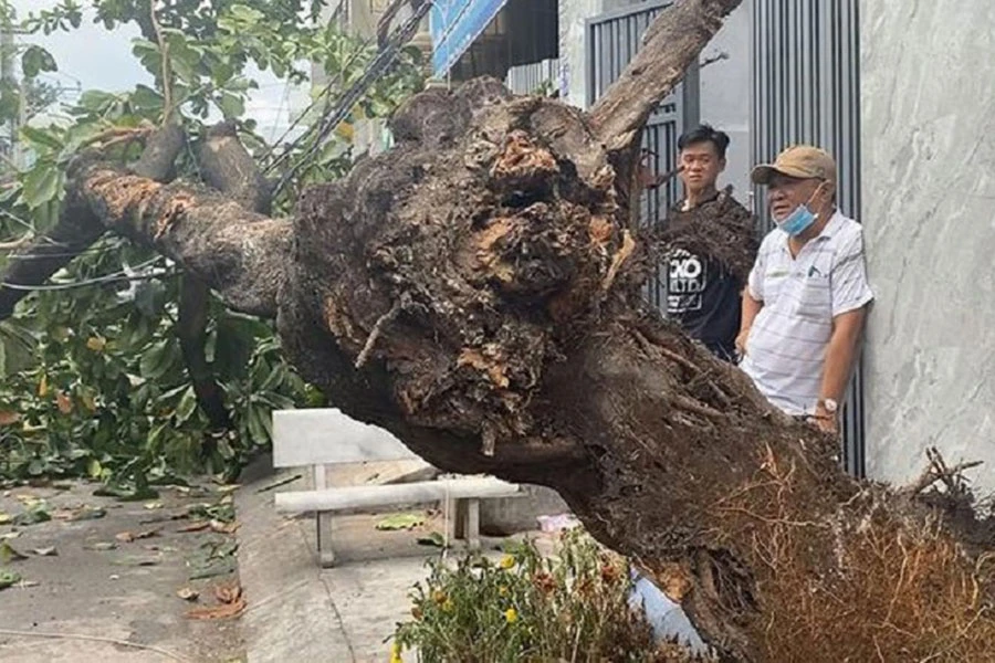 Mới đây, trên đường Ỷ Lan (phường Hiệp Tân, quận Tân Phú, TP.HCM), một cây bàng cao hơn 15 m, đường kính gốc hơn 40 cm, cành lá xanh tốt nhưng phần gốc đã hư mục bị xe tải va trúng. Cú va chạm khiến cây bàng bị bật gốc, đè trúng đường dây điện.