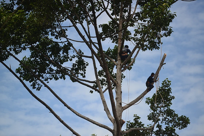 Công nhân cưa bỏ phần tán cây. Ảnh: Lê Quân