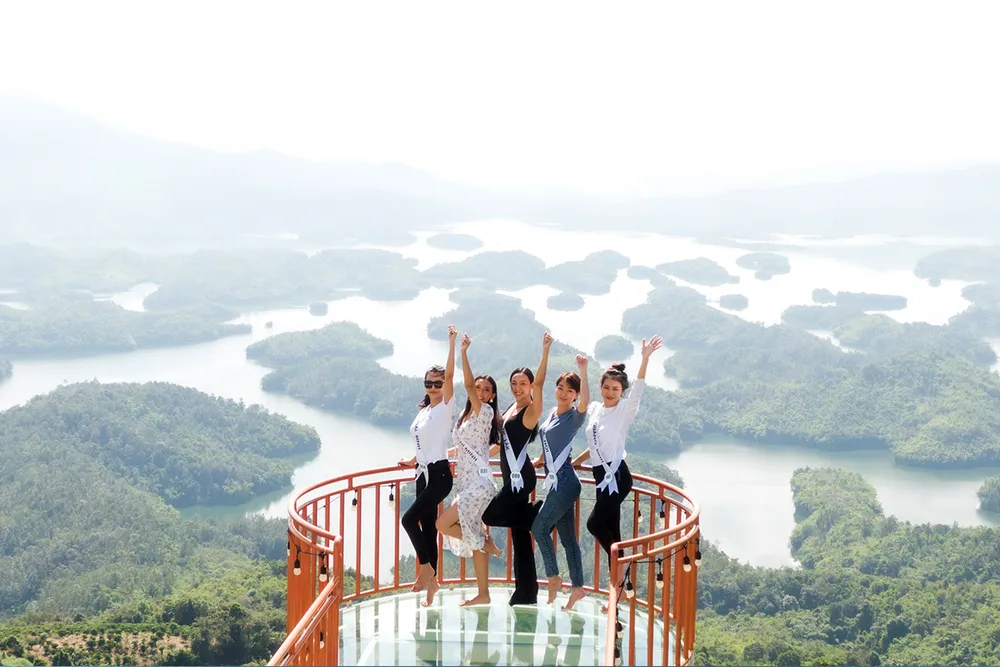 Các thí sinh Hoa khôi du lịch Việt Nam chụp ảnh quảng bá cho hồ Tà Đùng thuộc Công viên địa chất toàn cầu Đắk Nông. Tối 29-11, chung kết Hoa khôi du lịch Việt Nam sẽ diễn ra tại Đắk Nông. (Ảnh do ban tổ chức cung cấp)