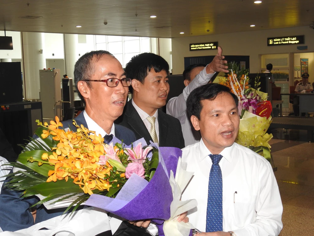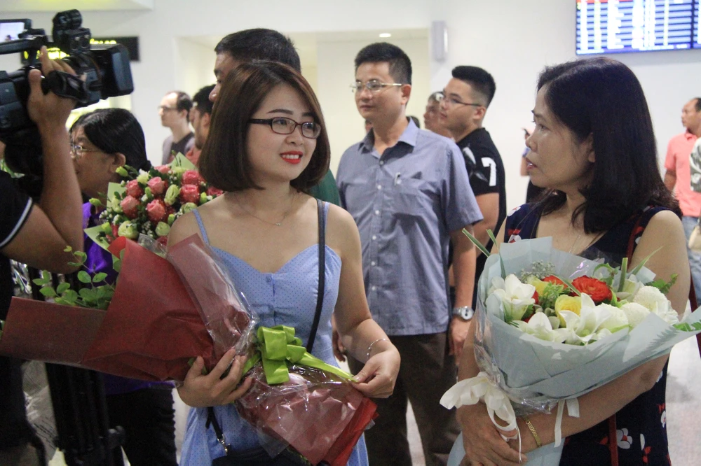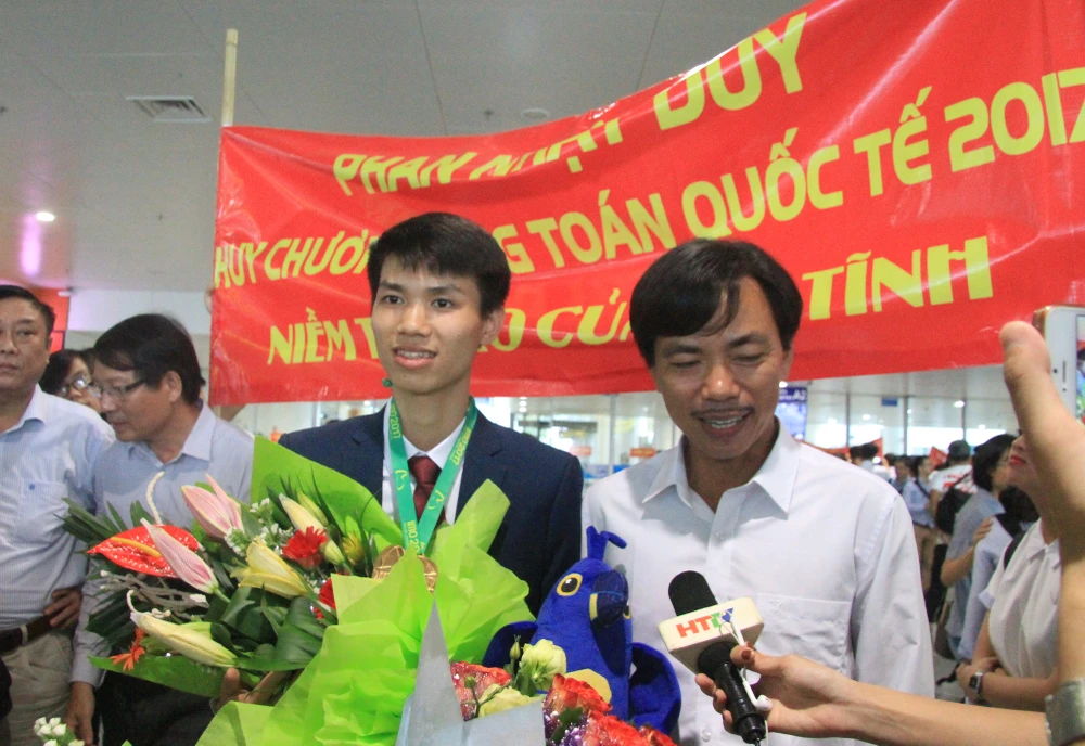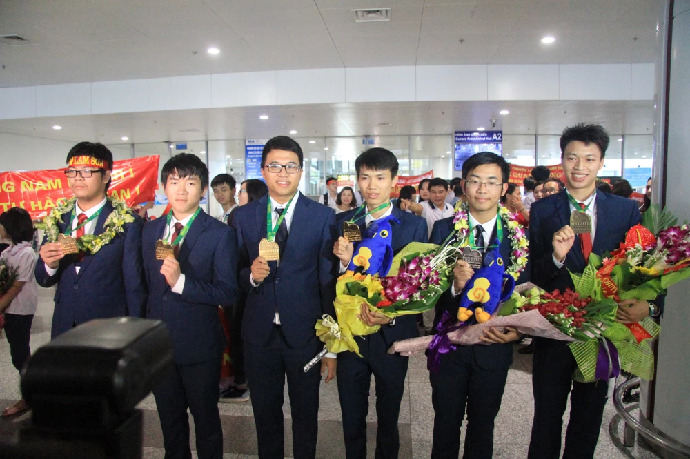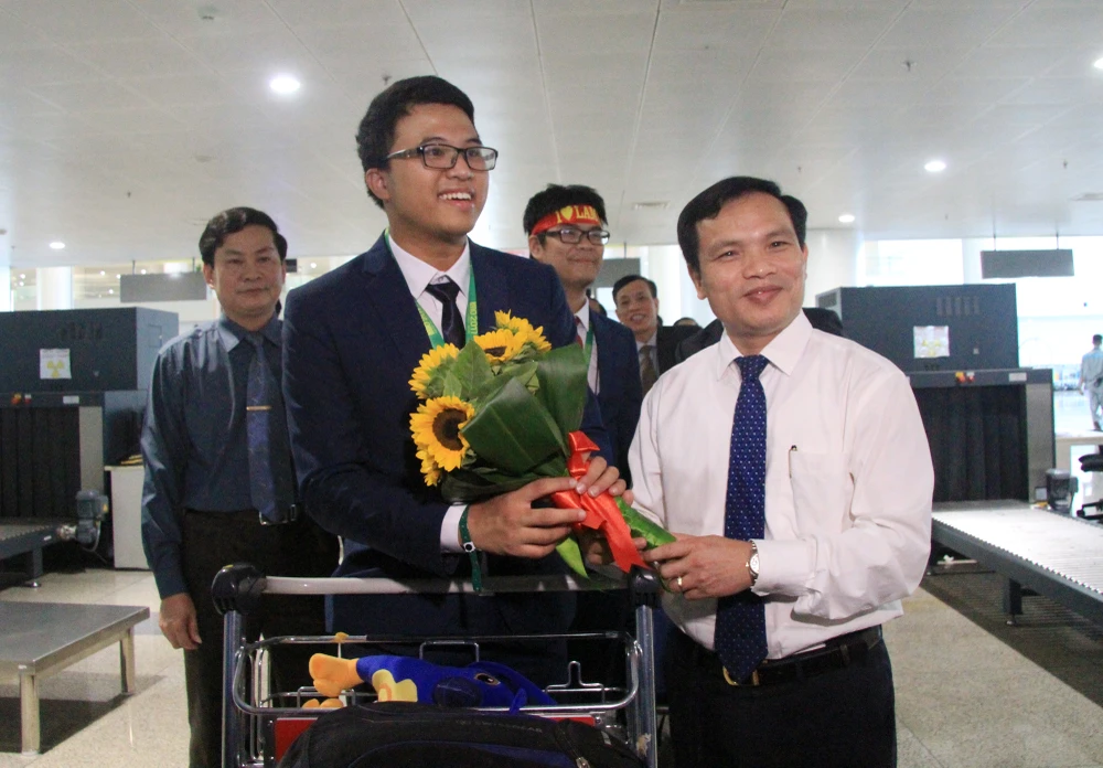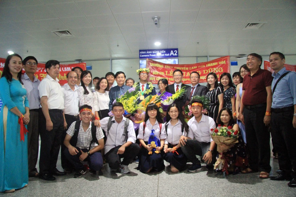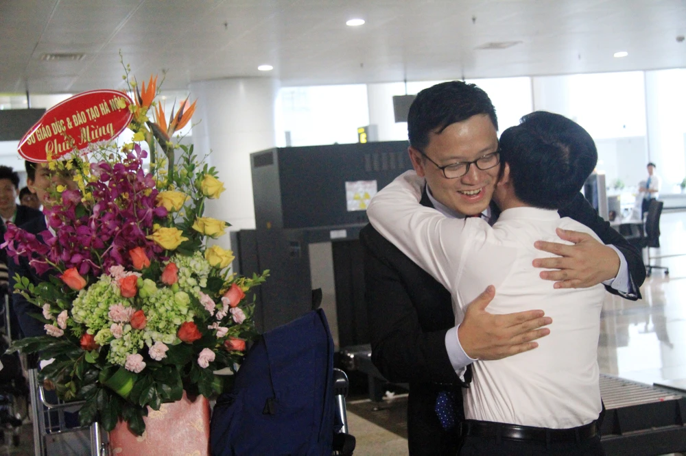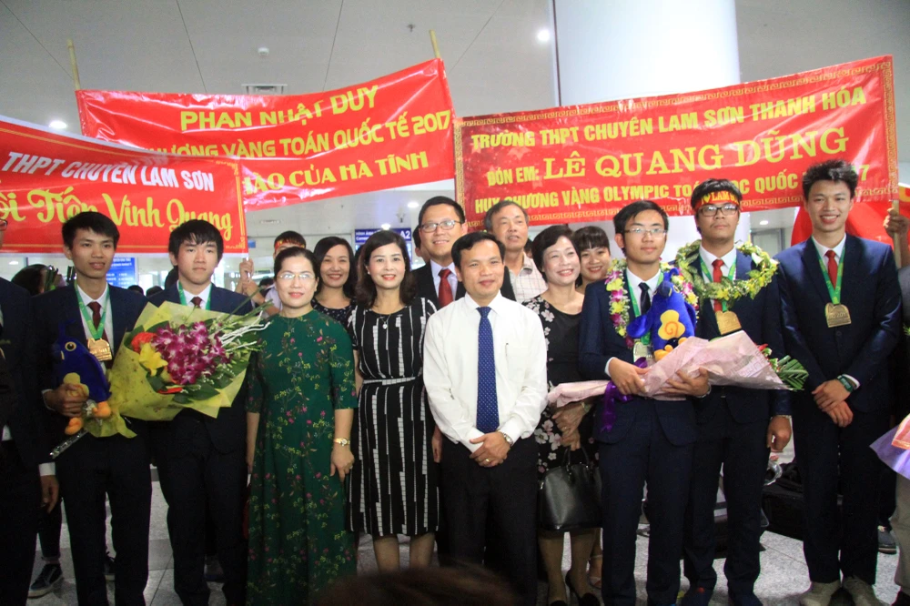 Khoảng 7 giờ 30 sáng nay, đoàn dự thi Olympic Toán học quốc tế đã có mặt tại Nội Bài, ông Mai Văn Trinh vui mừng đón đoàn.