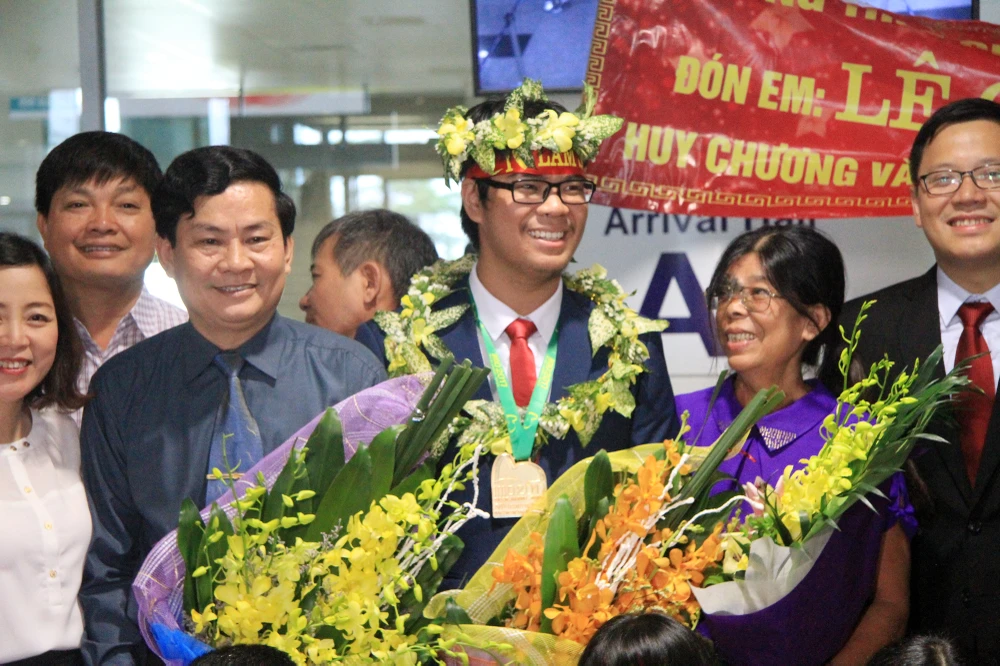 Lê Quang Dũng, huy chương vàng Olympic Toán học quốc tế 2017, tươi cười, phấn khởi trong hoa, cờ của bạn bè, thầy cô.