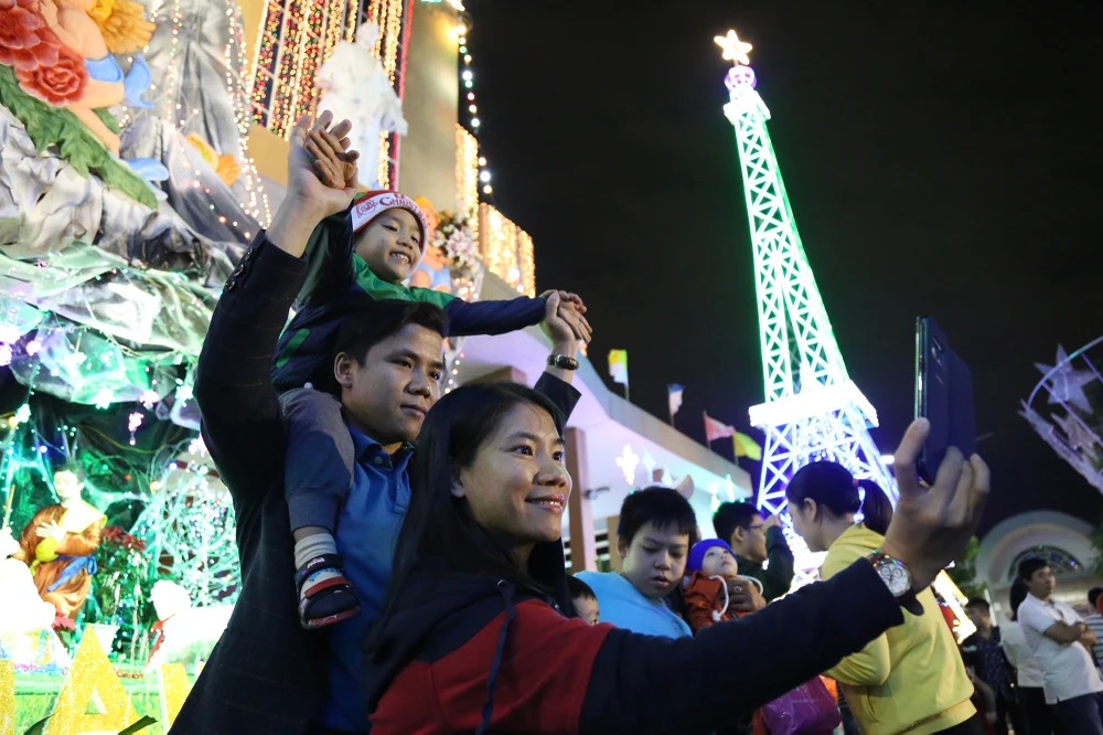 Chị Phạm Thị Hà Giang cùng gia đình tìm đến nhà thờ chơi Noel sớm. "Mọi năm đợi đến đúng lễ mới đi chơi Noel nhưng quá đông người, phải chen chúc nên năm nay gia đình quyết định đi chơi sớm" - chị Hà Giang chia sẻ.