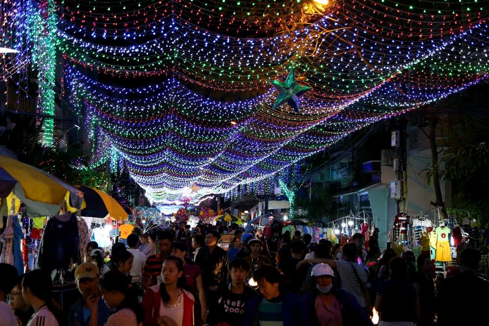 Không chỉ có hang đá, cây thông, xóm đạo Tân Phú còn có những con đường đèn lung linh màu sắc với lối trang trí đẹp mắt và hoành tráng bậc nhất Sài Gòn.