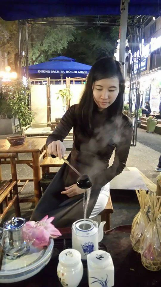 Nhân viên một gian hàng sách pha trà Việt trên đường sách TP.HCM.
