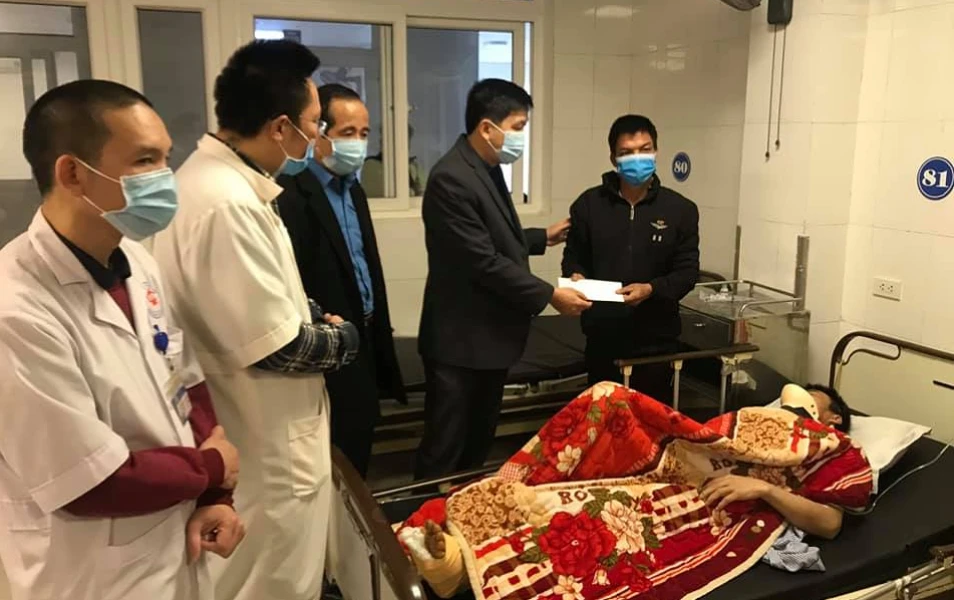 Ông Kha Văn Tám- Tỉnh ủy viên- Chủ tịch Liên đoàn Lao động tỉnh Nghệ An cùng BS Phạm Quốc Dương- Chủ tịch Công đoàn ngành Y tế tỉnh Nghệ An thăm hỏi, động viên các lao động không may bị nạn. Ảnh: Đ.L