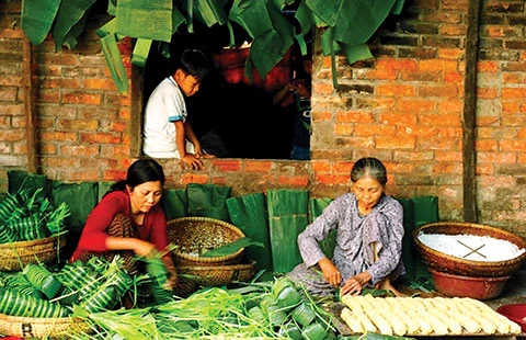 Cứ mỗi độ tết đến xuân về là cả gia đình tôi lại quây quần trước bàn thờ gia tiên gói bánh. Mỗi người một việc. Mẹ lau lá, cha chuốt lạt. Bà tôi ngồi xếp bàn trên chiếu hoa, trước mặt là chiếc mâm đồng sáng lóa, tay thoăn thoắt đặt lá, đổ nếp, rải nhân… Cứ thế, từng chiếc bánh chưng vuông vắn, bánh tét tròn trịa ra đời. Anh em tôi chuyền tay nhau những chiếc bánh mới ra lò của bà để chăm chút lại từng nuột lạt. Rồi tối ấy, cả nhà ngồi thâu đêm trong chiếc nong đặt ở góc sân mà trông nồi bánh tét. Khuya, bên ly cà phê bốc khói, câu chuyện giữa người đi xa và người ở nhà càng trở nên thú vị. Cuối cùng là niềm vui vỡ òa khi tiếng chuông chùa rền vang báo hiệu thời khắc giao thừa đã đến.