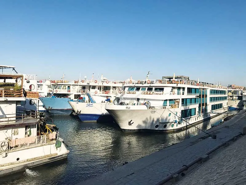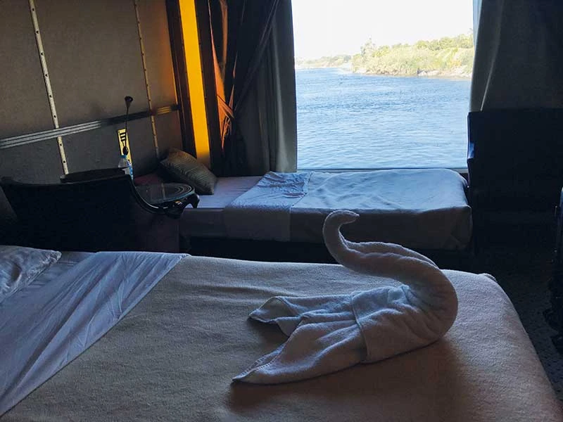 Nỗi ấm ức vì căn phòng dành cho mình khá “mini” so với hình dung ngay lập tức được xoa dịu khi tôi nhìn ra bên ngoài. Dòng Nile đang êm đềm chảy ngoài cửa sổ, xanh màu nước biển chứ không trắng nhờ như lúc ở Cairo. Phía sau và phía trước thuyền tôi là những con thuyền khác, đều đứng im. Trong bữa ăn trưa, người phục vụ cho tôi biết lý do các con thuyền không di chuyển: Thủy triều đang xuống thấp và việc chờ đợi nước lên là điều hết sức bình thường ở lưu vực này.