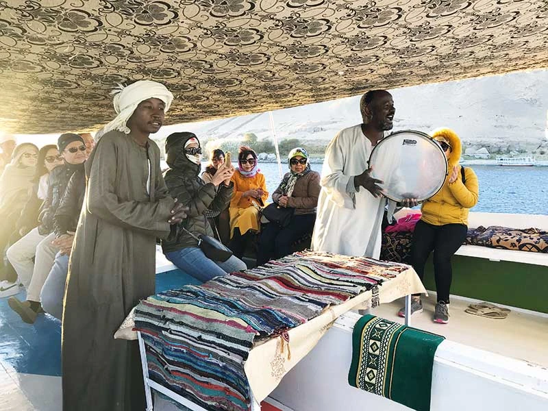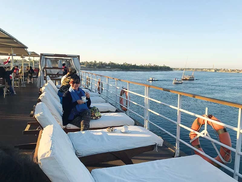 Buổi chiều đầu tiên trên du thuyền, nắng vẫn vàng ngọt. Chúng tôi được đưa từ thuyền lớn sang thuyền nhỏ có cặp mắt đuôi dài y chang sông nước quê mình. Có điều con mắt thuyền Ai Cập được vẽ gần giống với mắt người hơn với đường nét to dài và hàng mi cong rợp. Thuyền trôi nhẹ nhàng, gió sông phả lên mát rượi khiến chúng tôi hồ hởi trong dạ cho đến khi nó… đụng vào đá ngầm. Ba người lái thuyền trấn an rằng nước đang rút và họ sẽ cố gắng gỡ mũi thuyền khỏi đá, nhanh thôi. Sóng nước sông Nile đã cho những người lái thuyền một bản lĩnh lạ thường. Sau khi lèo lái con thuyền thoát hiểm, họ gõ trống, ca hát và bắt đầu… bày bán các sản phẩm lưu niệm như cá sấu gỗ, vòng tay, hoa tai. Chưa hết bực bội vì sự cố đá ngầm, tôi không mua ủng hộ họ bất cứ món gì. Chừng lên lại thuyền lớn, thấy bàn chân của một trong ba người bật máu, tôi mới thấy ân hận.