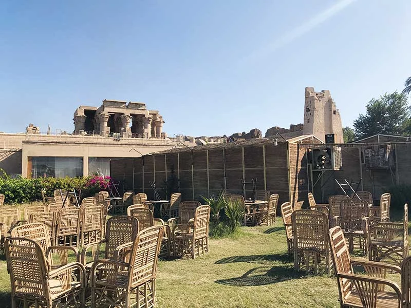 Chiếc thuyền di chuyển suốt cả đêm để kịp đến thành phố nông nghiệp Komombo. Chúng tôi được hướng dẫn lên bờ để tham quan ngôi đền Sobek linh thiêng. Ngôi đền vừa thờ thần sông nước Sobek vừa thờ thần chim ưng Haroeris. Trước đền thờ là một quán cà phê cực kỳ ấn tượng. Dù che, bàn ghế, phòng uống cà phê đều được làm từ mây tre lá. Ngồi ở bất kì vị trí nào trong quán cũng có thể trông lên đền Sobek.