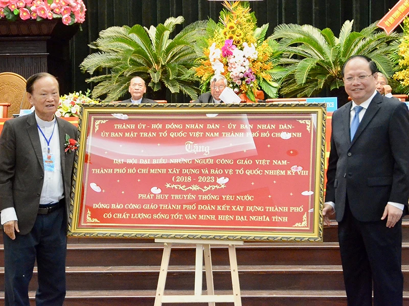 Phó Bí thư Thường trực Thành ủy Tất Thành Cang tặng khánh vàng cho Đại hội đại biểu người Công giáo Việt Nam TP.HCM xây dựng và bảo vệ Tổ quốc lần thứ VIII nhiệm kỳ 2018-2023. Ảnh: tá lâm
