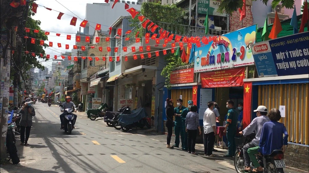 Sáng 23-5, tại Trường mầm non 2-9, khu vực bỏ phiếu số 108, cử tri của 10 tổ dân phố thuộc phường 17, quận Bình Thạnh, TP.HCM đi bỏ phiếu bầu đại biểu Quốc hội khóa XV và đại biểu HĐND các cấp nhiệm kỳ 2021-2026.
